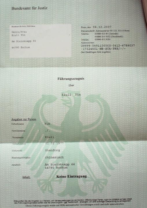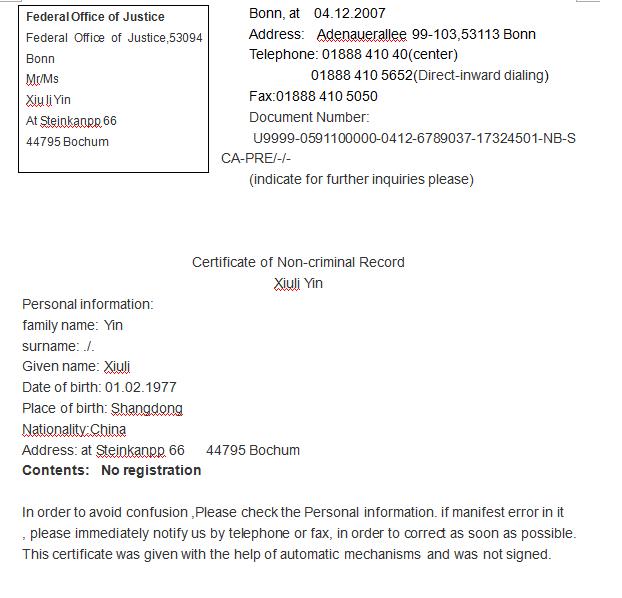 無犯罪記錄證明--德國--用于北京民政局涉外婚姻登記,立等可取,涉外婚姻登記需要民政局認(rèn)可的正規(guī)翻譯公司翻譯