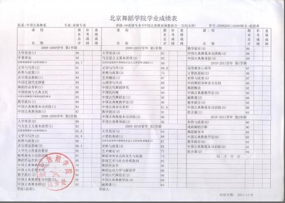 School (seal): Academic Affairs Division of Beijing Dance Academy Reviewer: Printing Date: November 8, 2011